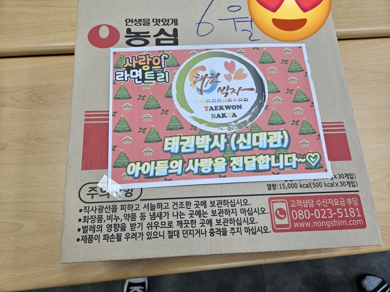 태권박사(신대관)에서도 라면 한 박스(30)개도 부성1동행정복지센터를 통해 후원 받았습니다.